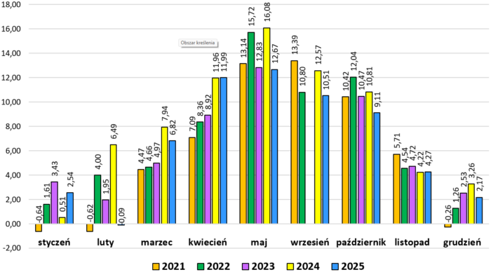 Porównanie rzeczywistych średniomiesięcznych temperatur zewnętrznych w poszczególnych miesiącach grzewczych w latach 2021- 2025.
