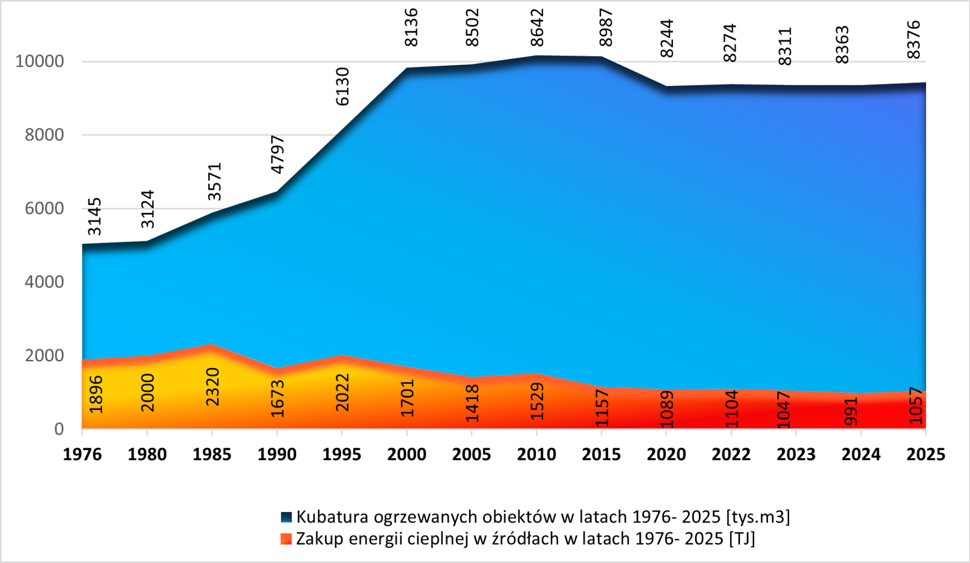 Wzrost kubatury ogrzewanych zasobów mieszkaniowych wiąże się z podłączeniem do miejskiej sieci ciepłowniczej nowych obiektów.